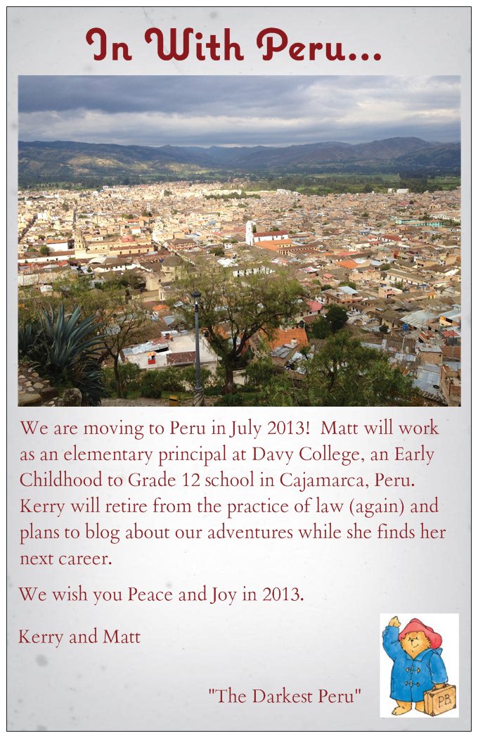 I’m an American who embarked on a new ex-pat life and left my lawyer self behind. My husband, Matt, and I are born and raised Wisconsinites who in 2013 decided to incorporate our love of travel and experiencing new cultures into our daily lives by chucking our jobs, home and delightful lives in the States in exchange for a mid-life adventure. Matt’s status as an educator provides international employment opportunities for him, and I am along for the ride as a “trailing spouse.” First stop – Cajamarca, Peru!
